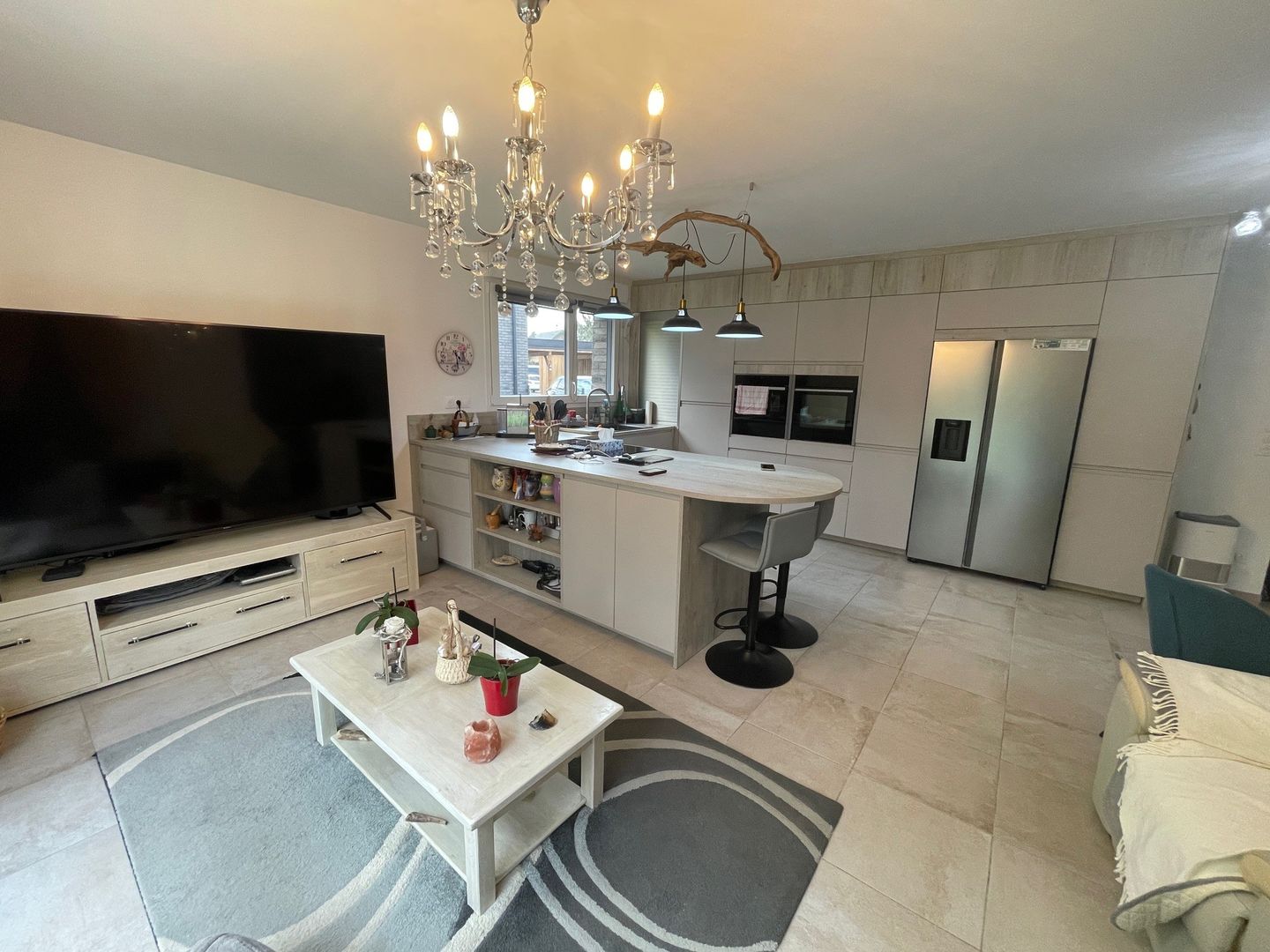 - un salon avec cuisine équipée ouverte bénéficiant d'un ilot central